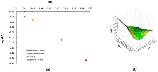 (a) Relationship between pH vs. logpCO2; (b) relationship between pH vs. SIcalcite vs. logpCO2 in reservoir and well waters. Red colored part of floating chart represents well water while yellow and green colored parts represent reservoir waters.