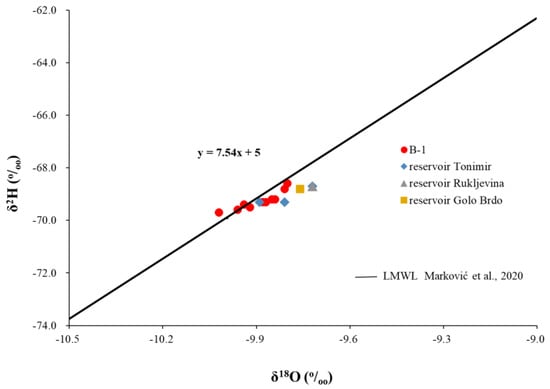 All measured values for δ2H and δ18O in reservoirs and wells indicate that the water has a meteoric origin (Figure 5), as they are scattered around the local meteoric water line (LMWL) of the study area []. Values of isotopes ranged from −9.98 (well B-1) to −9.72‰ (reservoirs T and R) for δ18O, and from −69.3 (reservoir T) to 68.6‰ (well B-1) for δ2H. According to the measured δ2H and δ18O values in the water from reservoirs, there was no evaporation effect during the sampling campaigns, indicating a short water retention time. Consequently, the retention time is not long enough to be affected by seasonal temperature changes, which could potentially affect water temperature in reservoirs and thus isotope fractionation.