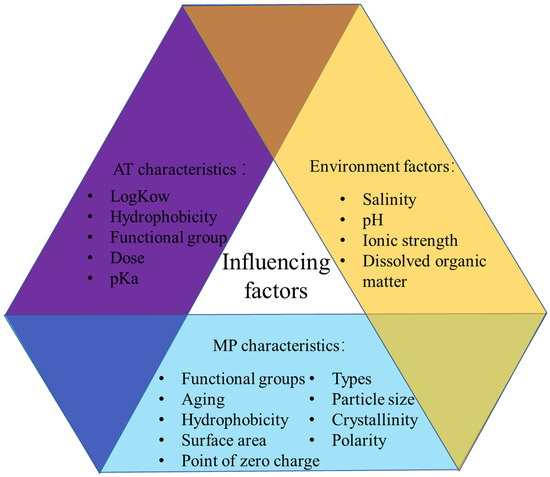 In aquatic environments, MPs and ATs interact with each other in various ways. The interaction process is influenced by the physicochemical properties of MPs, the physicochemical properties of ATs, and environmental factors (Figure 5).