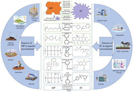 The interaction between ATs and MPs has various principles of action, mainly including hydrophobic interactions, intermolecular interactions, and electrostatic interactions, among other forces. The dominance of the above forces varies between different types of MPs and ATs, depending on MPs properties, ATs properties, and environmental factors. In addition, micropore filling, charge-assisted hydrogen bonding (CAHB), cation-π bonding, halogen bonding, and CH/π interactions may occur between some specific types of MPs and ATs, but further studies are needed to confirm their involvement processes and importance. The sources and interaction mechanisms of MPs and ATs in aquatic environment are shown in Figure 6.