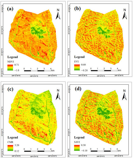 Spectral indices (a) NDVI; (b) EVI; (c) CMR; (d) SAVI from Landsat 8 images.