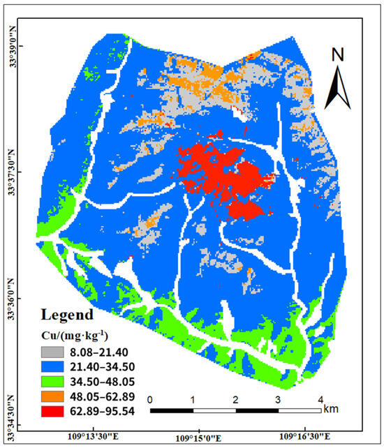 Figure 7 shows that the area was filled with higher concentrations of Cu, mainly in the mining area and its surrounding areas. Cu was distributed in the soil along the roads in the northern and southern parts of the mining area, as the ores and slag were dropped by vehicles carrying the ores. According to Ref. [28], the screening value of soil contamination risk on agricultural land for Cu content is 50 mg·kg−1. From Figure 7, Cu concentrations in the mining area (red colour) and a part of its out-ring (ore stacking area) exceeded the risk value of soil contamination on agricultural land, but did not exceed the state standard of soil environment background value in China. Thus, soil environment monitoring in the area should be strengthened. In addition, this spatial distribution pattern is consistent with the spatial distribution patterns of heavy metals obtained in previous studies [4,11]. Note that a masking treatment was applied (white area) owing to the lack of soil on roads and buildings in the study area.