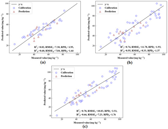 In group A, the test set scatter points along the y = x line exhibited a relatively larger deviation than those of the training set in the scatter plot. According to the evaluation criteria of the model’s inversion ability [24], this indicates that the model has ordinary ability in regression of heavy metal content (0.5 ≤ R2 ≤ 0.65 or 1.5 ≤ RPD ≤ 2.0) but does not meet the approximate standard of the regression model (0.65 ≤ R2 ≤ 0.81 or 2.0 ≤ RPD ≤ 2.5).