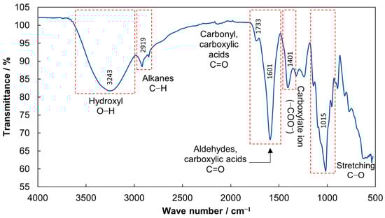 A weaker peak at 1733 cm−1 (Figure 1) is associated with the stretching vibration of the C=O bond, which indicates the presence of the carbonyl group [24,38,39,40]. This carbonyl indicates an ester form of carboxylic acid where carbonyl is esterified [41,42]. Choudhary et al. [43] attributed this peak to the C=O stretching of the methylated or protonated (non-ionized) form of the carboxyl group, indicating the presence of the methyl ester of galacturonic acid [44] since the galacturonic acid can be found with the free carboxyl group or with the carboxyl esterified with methanol. Therefore, galacturonic acid in the mucilage is the main factor in carrying out a coagulation process and reduces the turbidity in the wastewater, as was reported by Aguilera-Flores et al. [13].
