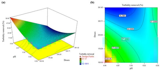 Although various factors influence the effectiveness of wastewater treatment by coagulation, the pH and the doses have been considered the most essential parameters in this process [61]. Therefore, an optimization analysis was performed using the quadratic model described in Equation (2) to achieve the maximum percentage of turbidity removal.