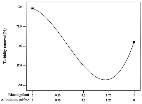 It can be noted in Figure 3 that turbidity removal is more sensitive to the aluminum sulfate effect than the biocoagulant. Its potential decreases as the biocoagulant proportion increases in the mixture. The turbidity removal could be improved using a prickly pear peel waste biocoagulant as a coagulant aid mixed with aluminum sulfate [21] since the turbidity removal is 1.22 times higher with a mixture’s proportion of 0.25 of the biocoagulant and 0.75 of aluminum sulfate than 1.00 of the biocoagulant. However, the prickly pear peel waste biocoagulant as a coagulant aid is not functional when used with a mixture proportion of between 0.67 and 0.75 since the turbidity removal decreases (Figure 3). Therefore, an optimization analysis was performed using the mathematical model shown in Equation (3) for achieving the highest percentage of turbidity removal under the following criteria: minimum and maximum amounts of aluminum sulfate and biocoagulant, respectively.