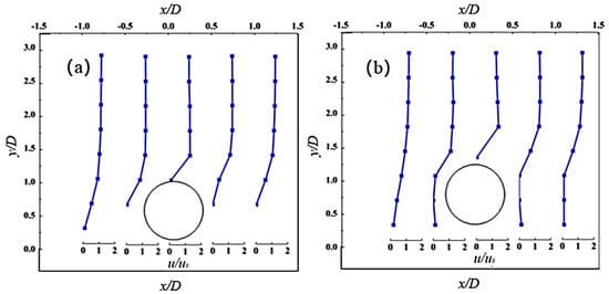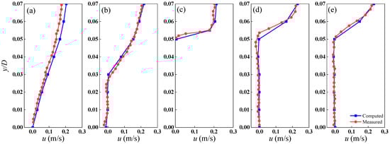 Based on the selected measurement points in the experiment, Figure 2 compares the velocity profiles at different distances from the pipeline, namely, x = −D, x= −0.5D, x = 0, x = 0.5D, and x = D (the negative sign represents the upstream side of the pipeline). The blue lines represent the numerical results, while the red lines represent the experimental results. It can be observed that the numerical results are in good agreement with the experimental data, confirming that the ISPH numerical model can accurately simulate the flow field changes near the pipeline.