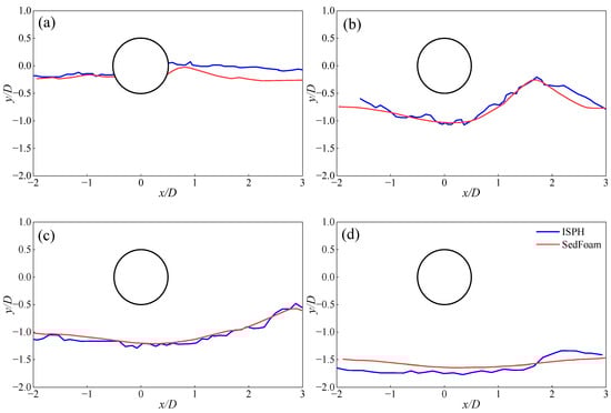 In Figure 4, the corresponding gap ratios for (a), (b), (c), and (d) are e/D = −0.25, 0.25, 0.5, and 1.0, respectively. By comparing the ISPH simulation results with the SedFoam results of Akter-Uz-Zaman [27], it can be observed that the bed profile results are basically consistent. As the pipeline position increases, the equilibrium scour depth gradually decreases. In the range of 0 < e/D < 1.0, it can be found that the bed profiles are greatly influenced by burial depth. In the case of e/D < 0, there is almost no changes for the bed profiles, indicating that the pipeline buried deeper in the sand bed is relatively stable. To give a quantitative description of the agreement, the following root-mean-square errors of simulated bed profiles are presented in Table 3 for four different gap ratios e/D = −0.25, 0.25, 0.5, and 1.0.