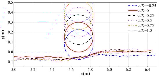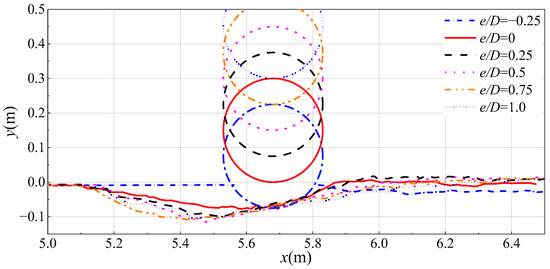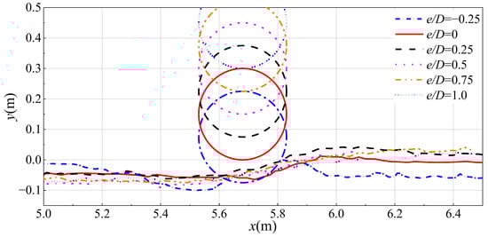 From Figure 6, it can be observed that at t = 15 s, the erosion extent behind the pipeline is greater compared to 10 s for the case of e/D = −0.25. In the cases where e/D ≥ 0, it can be seen that the mobilized sediment accumulates behind the pipeline, forming a sand slope with a noticeable inclination. Similar to 10 s, the scour depth increases with an increase in the gap ratio e/D. When e/D = 0.5, the accumulated sand dune behind the pipeline is higher, indicating intense sediment transport around the pipeline. It can be observed that the erosion develops more rapidly in Figure 6 than that in Figure 5. At 15 s, the erosion extent on the sediment bed in front of the pipeline is greater compared to 10 s, and the scour depth also increases. The curve in the x-direction from 5.0 m to 5.2 m shows a significant decrease compared to 10 s.