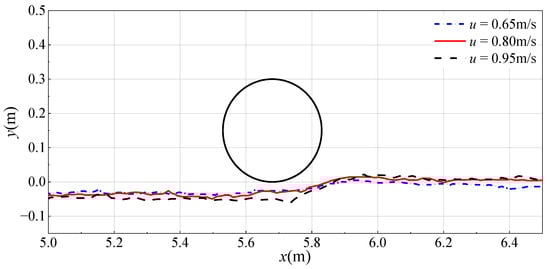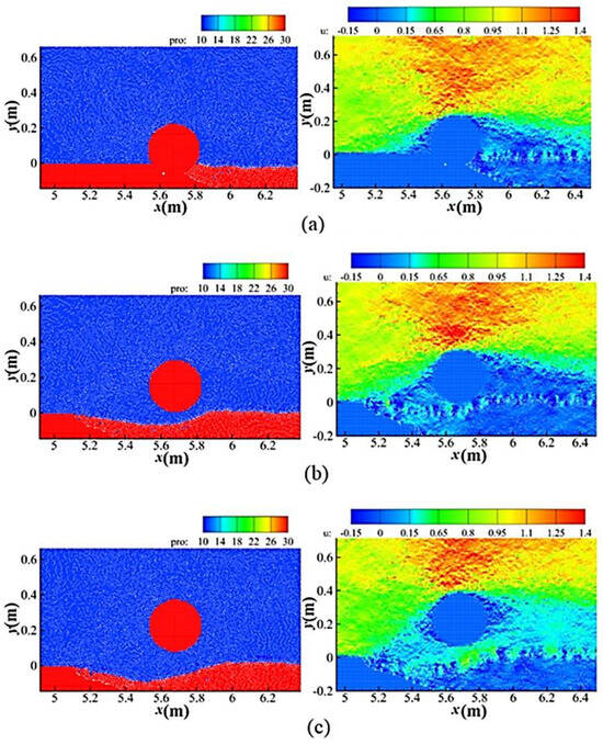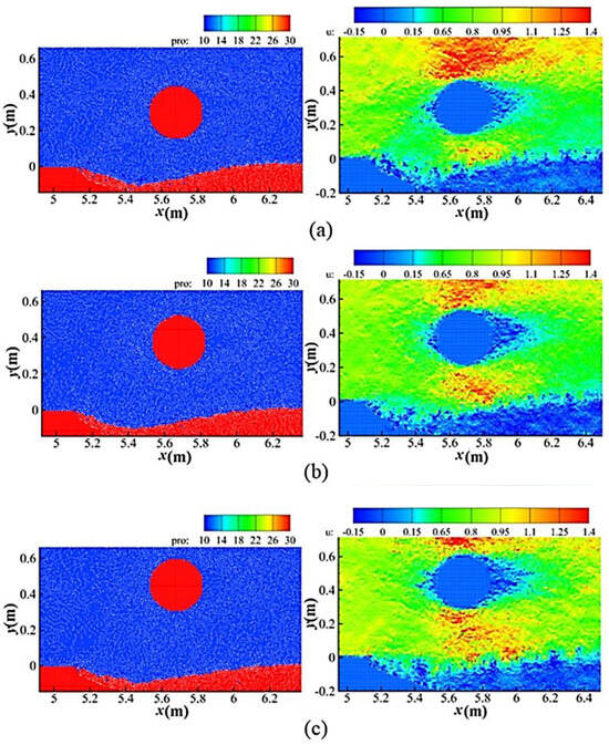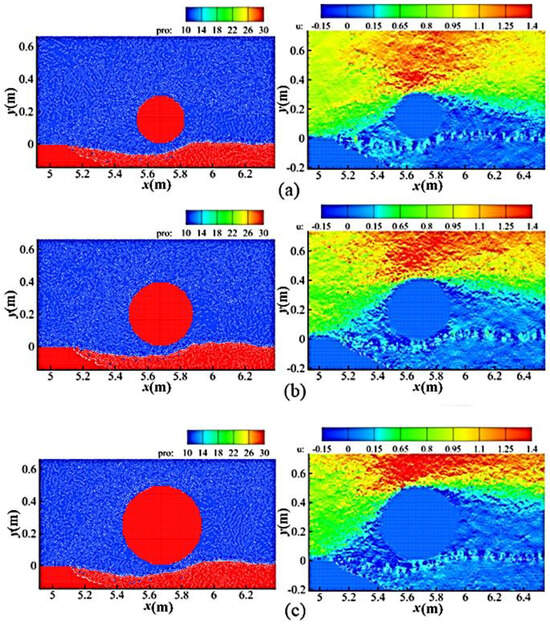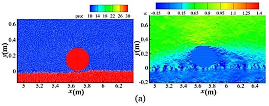 Before simulating the sediment erosion around the submarine pipeline, the flow field calculation around the pipeline is validated using the experimental data from Oner et al. [32]. The model used in the validation has a length of 7.26 m, a total number of particles of 124,259, a numerical particle diameter of 0.005 m, and a pipeline diameter D of 0.05 m. The flow direction is from left to right, with the outflow velocity set to be the same as the inflow velocity, and the water depth is 0.32 m.