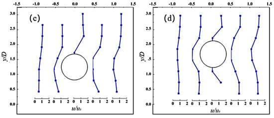 Horizontal velocity profiles around the pipeline for different gap ratios 0 (a), 0.25 (b), 0.5 (c), and 1.0 (d).