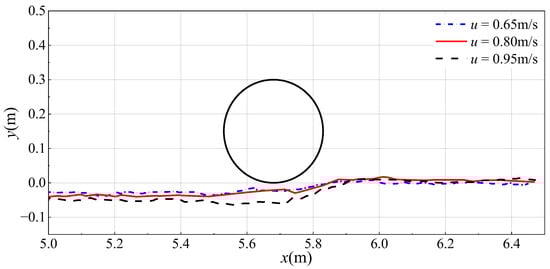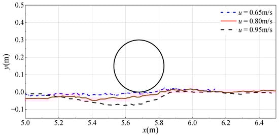Figure 12, Figure 13 and Figure 14 show the bed profiles around the pipeline at three instantaneous moments (t = 10 s, 15 s, and 20 s) under inlet flow velocities of 0.65 m/s, 0.8 m/s, and 0.95 m/s, respectively. The erosion extent in front of the pipeline at 15 s and 20 s is greater than at 10 s, with larger scour depth. The bed profiles from x = 5.0 m to x = 5.2 m in the x-direction decrease significantly compared to the bed profiles at 10 s. The erosion pits gradually extend towards the front of the pipeline.