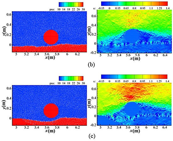 Figure 8 presents the bed profiles around the pipeline (left column) and velocity contour of the flow field at 10 s for gap ratios e/D= −0.25, 0, and 0.25, respectively. Figure 9 show those for gap ratios e/D = 0.5, 0.75, and 1.0, respectively. The “pro” property represents the particle property, with pro = 10 representing water particles and pro = 30 representing sediment particles (red representing sediment and cylinders, and blue representing water), while “u” represents the horizontal flow velocity. The flow direction is from left to right (the same hereinafter).