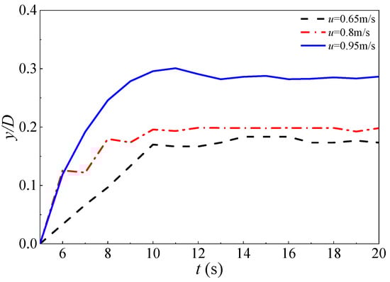 Figure 16 shows the curve of the maximum scour depth (y/D) as a function of time for different inlet flow velocities. It can be observed that the maximum scour depth increases with time. Under the condition of an inflow velocity of 0.95 m/s, the maximum scour depth near the pipeline can reach 0.3D. As the inflow velocity increases, the slope of the curve becomes steeper. However, as the erosion progresses, the change in scour depth becomes less significant. A higher inflow velocity results in a larger equilibrium scour depth.