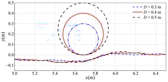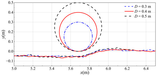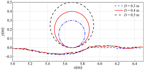 From the velocity contour maps of different diameters shown in Figure 20, it can be observed that as the pipeline diameter increases, the influence of the pipeline on the nearby flow field becomes more pronounced. The red area above the pipeline increases, indicating an increased flow velocity through the pipeline. Moreover, as the pipeline diameter increases, the flow velocity also increases.