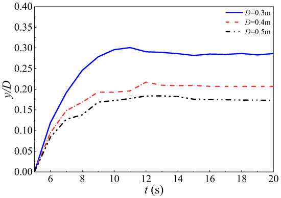 In order to better understand the influence of different pipeline diameters on erosion morphology and maximum scour depth, curves depicting the variation in maximum scour depth with time were plotted under the same inflow velocity condition. Figure 21 shows that when the pipeline diameter is 0.3 m, the maximum scour depth (y/D) is the greatest, while it is the smallest when the diameter is 0.5 m. The erosion intensity also rapidly develops during the initial erosion stage, with a speed several times faster than that of the later erosion stage. Furthermore, a certain pattern emerges: as the pipeline diameter increases, the slope of the curve becomes smaller and the maximum scour depth reached decreases. After a certain period of erosion, the change in scour depth becomes minimal. Additionally, larger pipeline diameters result in smaller equilibrium scour depths.