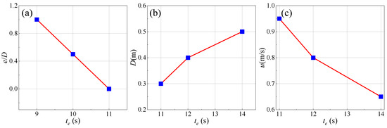 Figure 22b shows the scour equilibrium times for different pipeline diameters, D. Under the condition of D = 0.5 m, the scour equilibrium time near the pipeline is the slowest, taking 14 s. Conversely, under the condition of D = 0.3 m, the scour equilibrium time near the pipeline is the fastest, taking 11 s. As the pipeline diameter increases, the scour equilibrium time gradually decreases.