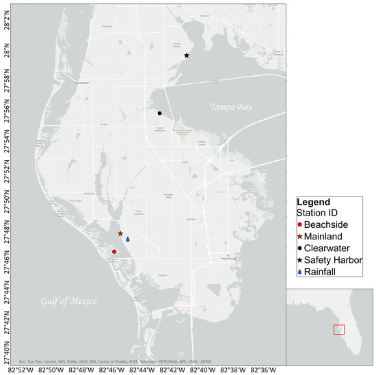 A map of the stormwater runoff and rainfall collection sites in Pinellas County, FL, for water used as inocula for the bioassays. The blue raindrop icon represents the rainfall collection site. Red (Beachside and Mainland) and black (Clearwater and Safety Harbor) colored icons represent sites used to collect stormwater runoff for the K. brevis and P. bahamense bioassays, respectively. The red square inset on the state of Florida to the right corresponds to the Tampa Bay region.