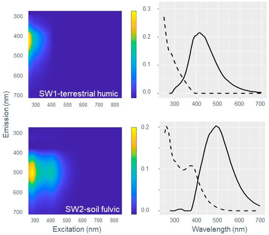 SW-MOD was fitted using the source water only (stormwater and rainwater) to minimize leverage due to increased fluorescence in the stormwater samples. Fluorescence EEMs and the corresponding excitation/emission spectra can be seen in Figure 3. SW-MOD is a two-component model, and both components exhibit combinations of Coble peaks A and C indicative of terrestrial humic substances [53], with slight shifts in their respective excitation/emission maxima. The first component (SW1-terrestrial humic) is considered terrestrial humic-like [70] and has similar spectral characteristics of DOM found in urbanized eutrophic environments [71]. SW1-terrestrial humic has two excitation maxima at <250 and 284 nm, and one emission maximum at 413 nm. This component matches closely with Coble peak A [53]. SW1-terrestrial humic was the dominant contribution of FDOM in all source water (Figure 3, Figure 4, Figure 5 and Figure 6).