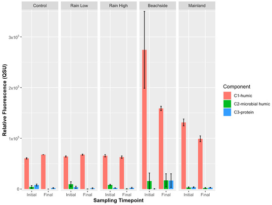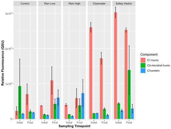 Changes in the relative fluorescence of FDOM components for the P. bahamense bioassay. The colored bars represent individual components, with comparisons between initial and final sampling timepoints for each treatment on the X-axis. The error bars represent the standard error of the mean. Relative fluorescence is expressed in quinine sulfate units (QSU).