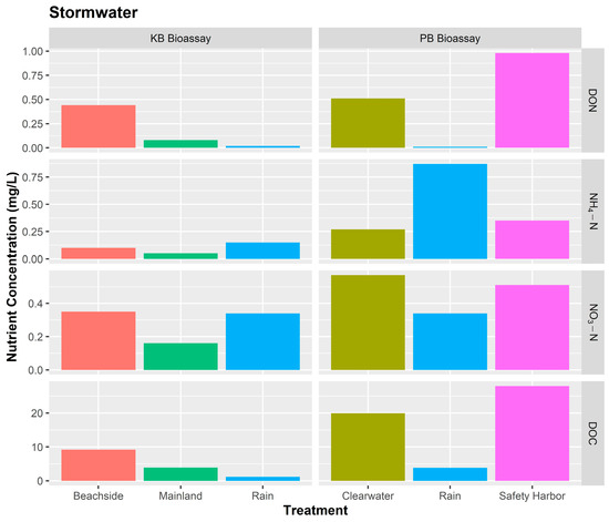 To determine the bioavailable DON (BDON) fraction within each stormwater treatment, BDON was calculated using the difference of the mean initial and mean DON concentrations at T72 for K. brevis and T48 for P. bahamense, and the percentage of BDON was calculated by dividing BDON by the initial mean DON × 100 (Table 4). These timepoints were chosen due to the observed depletion in DON, which was followed by the subsequent production of DON. For the K. brevis bioassay, BDON was 75%, 71%, 57%, and 50% for the Rain High, Beachside, Mainland, and Rain Low treatments, respectively. BDON was 100% for all treatments in the P. bahamense bioassay except for controls.