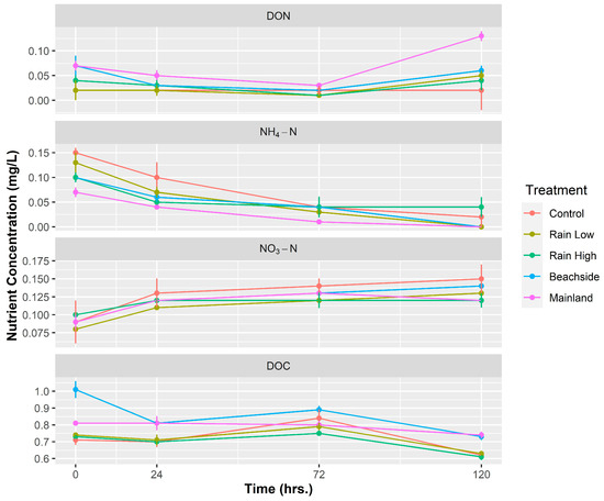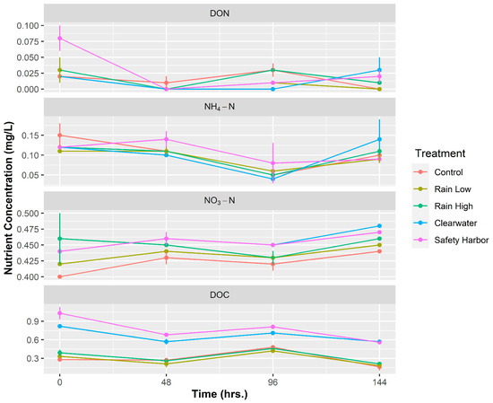 Change in concentrations of nitrogen forms (dissolved organic nitrogen = DON) and dissolved organic carbon (DOC) vs. time for the P. bahamense bioassay. Colored lines represent individual rainfall or stormwater treatments. Error bars represent standard error of mean. Note differences in Y-axes.