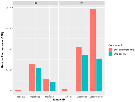 Relative fluorescence of components for stormwater runoff and rainfall used as inocula for K. brevis (KB) and P. bahamense (PB) bioassays. Colored bars represent individual components generated from PARAFAC model. SW1 represents terrestrial humic-like FDOM. Each stormwater or rainfall treatment collected for the respective bioassay is defined on the X-axis. Relative fluorescence is expressed in quinine sulfate units (QSU).