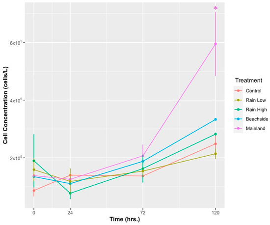 Beachside maximum cell concentrations (3.3 × 105 ± 3.6 × 103 cells L−1) were significantly greater than the Rain Low treatment (p = 0.02) and only slight significance was observed when compared to controls (p = 0.12). Beachside growth rates (µ = 0.63 ± 0.21 day −1) were also significantly greater than controls (p < 0.005), which were the highest across all treatments. All treatments had a lag time of 24 h, with the exception of controls (0 h).