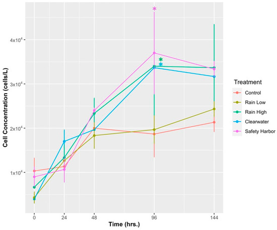 Pyrodinium bahamense cell concentrations vs. time in hours. Colored lines represent individual rainfall or stormwater treatments. Error bars represent standard error of mean. Colored asterisk denotes statistical significance of maximum cell concentrations vs. Control treatment (p ≤ 0.05).