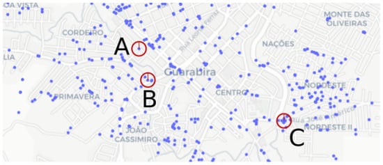 Figure 1, it is possible to visualize the occurrences recorded in the city of Guarabira–PB. The figure shows the map of the city and several blue dots representing the location of the failures. On the other hand, is possible see three highlighted points, where it is possible to perceive a central occurrence circled by a radius. This radius indicates whether other occurrences around it are new failures or recurrences of the main failure.