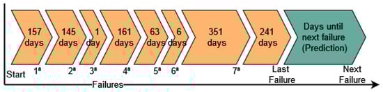 Finally, on the rightmost part of the figure, a blue block indicates the number of days between the last recorded failure and a new potential failure that may occur in the future. Therefore, this is the prediction objective of this study: to forecast the number of days between the last recorded occurrence and an estimated future failure.