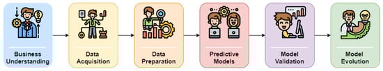 Figure 3, the work begins with understanding the business context in which the data are embedded. It is during this stage that the objectives of analysis and prediction are delineated. Next, the data collection and understanding work are carried out, with exploratory analyses aiding in understanding the information and phenomena present in the data. The third stage of the work consists of preparing the data to be used in predictive models. It is in this phase that the processes of data cleaning, variable selection, and data preparation with necessary transformations take place.