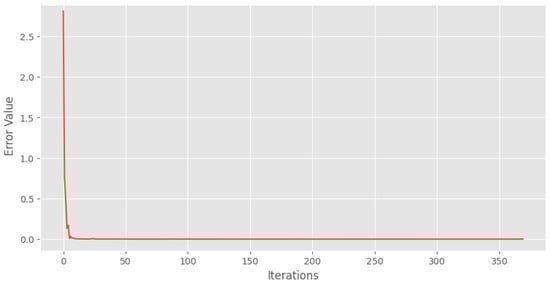 Four hidden layers contained, respectively, 128, 128, 648, and 550 neurons in each. The activation function used was ‘relu’ or rectified linear unit function. The training process occurred over 370 iterations and 100 epochs.Below, the convergence graph of the error in the training process is represented in