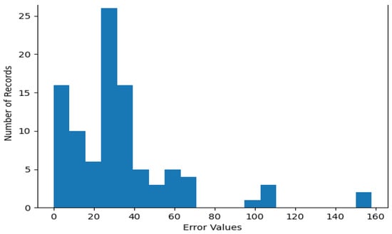 Figure 5 shows a histogram of the error obtained in the predictions of the Manual MLP model. The error values indicate the number of days of discrepancy between the predicted value and the expected value. In this graph, the majority of error values are below 40 days, and only five error values above 80 days were recorded.