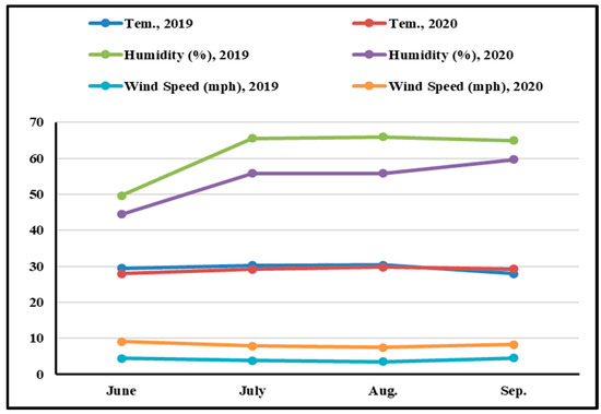 During the 2019 (1st season) and 2020 (2nd season) summer seasons, two field experiments were carried out at the experimental station of the Faculty of Agriculture, Cairo University, located in Giza, Egypt (30° 01′ 05.3″ N, 31° 12′ 21.1″ E) around 18 m above sea level. The soil-type of the experimental site is classified as a clay loam soil (Loamic (lo)), with 0.095, 0.085, and 0.670% of N, P, and K available, respectively, and a pH of 8.54. Figure 1 presents the average meteorological data acquired from a meteorological station located at the Agricultural Research Center in Giza, Egypt.