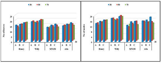 Number of leaves and Number of nodes as affected by water deficit, varieties, and deheading time interaction—L.S.D at 5%; 2.03 and 2.22, respectively. A: 45 days before harvesting, B: 21 days before, and C: no deheading (until harvesting).