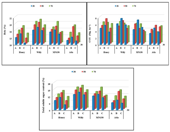 Brix (%), converted sugar yield (Mg ha−1), and total sugar (%) as affected by water deficit, varieties, and deheading time interaction—L.S.D at 5%; 1.21, 1.53 and 0.98, respectively. A: 45 days before harvesting, B: 21 days before, and C: no deheading (until harvesting).