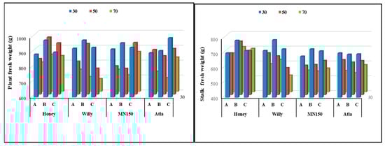 Plant fresh weight and stalk fresh weight (g) as affected by water deficit, varieties, and deheading time interaction—L.S.D at 5%; 114.8 and 89.26, respectively. A: 45 days before harvesting, B: 21 days before, and C: no deheading (until harvesting).