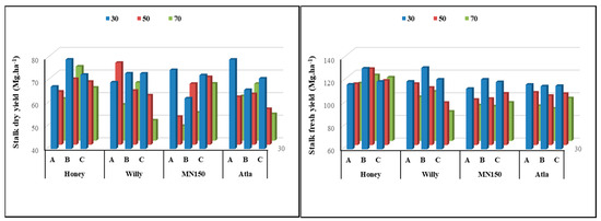 Stalk dry yield and stalk fresh yield (Mg ha−1) as affected by water deficit, varieties, and deheading time interaction—L.S.D at 5%; 14.22 and 14.91, respectively. A: 45 days before harvesting, B: 21 days before, and C: no deheading (until harvesting).