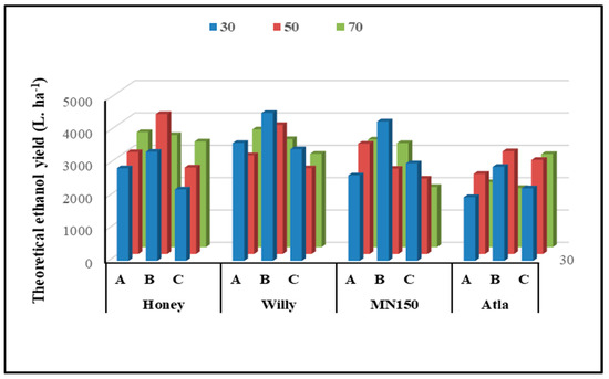 Theoretical ethanol yield (L ha−1) as affected by water deficit, varieties, and deheading time interaction—L.S.D at 5%; 899.7. A: 45 days before harvesting, B: 21 days before, and C: no deheading (until harvesting).