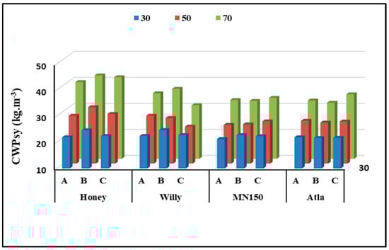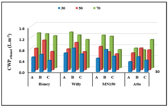 Crop water productivity (CWPsy) values varied depending on the specific treatment combinations. The highest CWPsy value of 42.10 kg m−3 was obtained when cultivating Willy+ with a 70% water deficit and deheading at 45 days. Notably, the Honey+ variety with a 70% water deficit and deheading 21 days before harvesting displayed the highest CWPcsy value of 2.21 kg m−3, along with the highest crop water productivity for ethanol (CWPethanol) value of 1.30 L m−3.