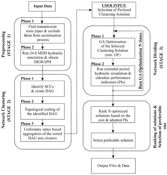 Sectorization is usually carried out as a two-stage procedure, as presented by most authors in the literature [1,11,12,13]: (1) the clustering stage and (2) the dividing stage. The clustering stage includes the division of the WDN into clusters based on the network topology, minimizing the number of connecting links. The dividing stage involves the placement of valves and flow meters on the cluster’s boundary pipes to define the DMAs.