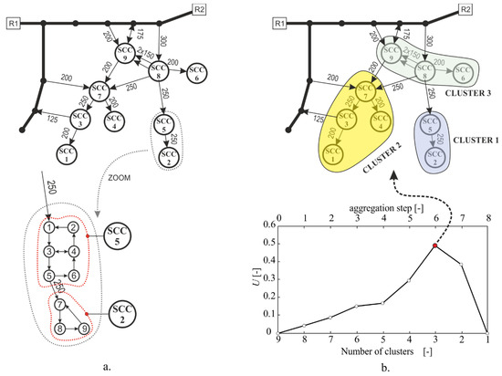 - The third phase is the aggregation of the sorted DAG into clusters, composed of the SCCs connected between each other and connected to the transmission main. Aggregation is conducted based on the network uniformity index (U) [42], defined as follows:where unet is the network uniformity in terms of cluster size, uv is the uniformity of the cluster’s size vector, and wagg is the relative weight of aggregated links.
