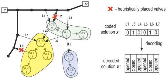 It is clear from Figure 3 that there are 8 links in total that should be equipped either with valves or with flow meters in order to fully define the DMAs. Prior to GA optimization itself, a two-step engineering heuristic procedure is employed in the DeNSE method to reduce the number of pipes whose status should be determined (i.e., open meter or closed valve):