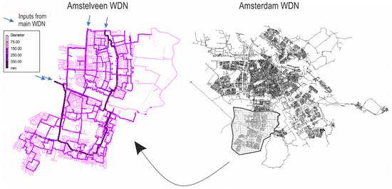 The DeNSE sectorization method, in the form presented in this paper, resulted from the research conducted as part of the Horizon 2020 research project No. 778136, named “Wat-Qual”. Research was conducted in cooperation with Waternet—the public utility company operating the water distribution network of the city of Amsterdam. Waternet personnel provided the necessary data for the development and testing of the proposed methodology on a real-sized WDN. This paper presents the results obtained for the Amstelveen WDN, which is a suburban part of the Amsterdam metropolitan area (Figure 4). The Amstelveen part of the network was chosen as it can be easily hydraulically isolated from the rest of the Amsterdam WDN and, with roughly 45,000 connections, is large enough to allow the proper evaluation of the methodology. This network could serve as an example for potential sectorization of other parts of Amsterdam’s WDN. The characteristics of Amstelveen WDN are as follows: number of links—N_l = 12,479; number of nodes—N_n = 11,729; number of demand nodes—N_dn = 5510; number of reservoirs—N_r = 4 (not real, but established as source nodes on locations where the network connects to the rest of the WDN); number of tanks—N_t = 0; number of pumps—N_p = 0; number of valves—N_v = 2144; number of connections—N_c = 44,429; total average demand in the network—Q = 521.3 m3/h. The peak demand hour is 8:00 a.m., with the demand of 1008.0 m3/h, with another peak from 7:00 to 8:00 p.m., with the demand of 720.0 m3/h. The minimum demand hours are from 1:00 to 6:00 a.m., with the demand of 273.6 m3/h.