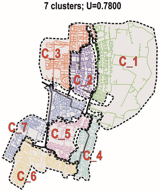 The solution with seven clusters shown in Figure 5 is selected as the preferable clustering solution in this case, as it completely satisfies the predefined sizing range (–). Although the network uniformity index value is slightly lower than UMAX, the value of uv, measuring the uniformity of the DMAs’ size vector, is the highest. There are 107 connecting links in total subjected to the GA optimization procedure in the following step to determine the positions of flow meters and valves and define the DMAs.