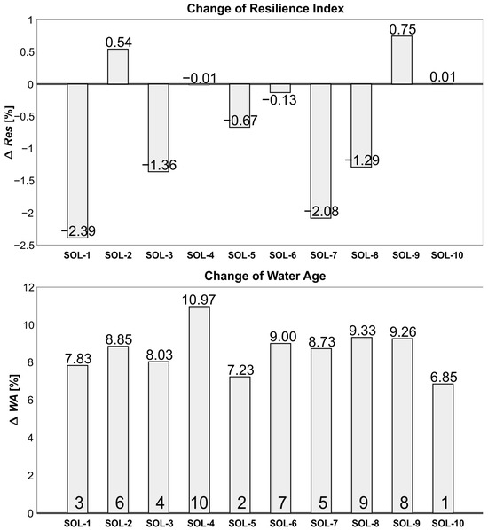 Water age, compared to the original layout of the network (ΔWA), is expectedly increased with the implemented network interventions—from 6.85% for solution SOL-10 up to 10.97% for solution SOL-4 (Figure 6). These percentages may seem high at first, but the absolute values of WA, given in Table 5, indicate that an increase in WA in the range of 1.40–2.25 h can be considered insignificant.