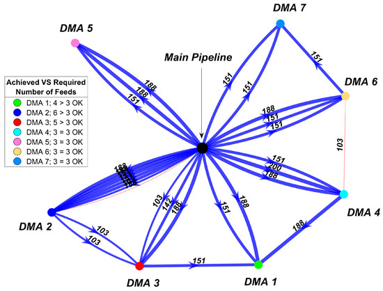 Based on the presented results, it can be concluded that all sectorization solutions are hydraulically feasible and minimally affect the original state of the network, as expressed through small changes in the three PIs measuring the network’s operational efficiency (ΔpAV, ΔRes and ΔWA). This leaves the cost of the solution as the main driving factor in the selection of the preferred sectorization solution. In addition to cost, the DMAs’ schematic connectivity plots for each optimized solution could be investigated to make a better-informed decision. The connectivity plot for the least expensive solution, SOL-2, is shown in Figure 8, in which DMAs are represented as the points of different colors connected to the main pipeline and between each other. Blue links with arrows indicate the feed lines, while red links are links in which water flows in both directions during the simulation. The thickness of the lines corresponds to their diameter, while diameters are also indicated in the middle of each link. All DMAs satisfy the requirement for the number of feeds, i.e., the achieved number of feeds is equal to or larger than the requirement, with most of them supplying water directly from the main distribution pipeline. Furthermore, an investigation of connectivity plots for other solutions reveals that all of them satisfy the feed requirement, but this is not reported here.