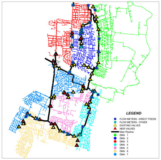 To gain full insight into DMA connectivity and layout, both connectivity plots (Figure 8) and network plots, with the exact positions of flow meters and valves (Figure 9), should be investigated. In Figure 9, flow meters are shown as (1) flow meters on direct feeds (marked with dark blue square markers)—i.e., flow meters on pipes where water does not change its flow direction during simulation—and (2) flow meters on other pipes (marked with light blue square markers)—i.e., flow meters on pipes that do change flow direction. Two types of valves are marked as (1) existing valves (marked with yellow triangle markers), i.e., a valve already exists on the pipe marked for closure, so there is no need to install a new one, and (2) new valves to be installed (marked with red triangle markers).