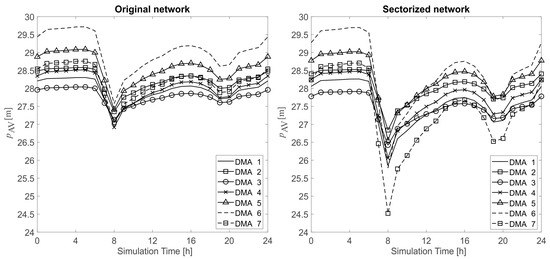 Figure 11 shows a comparison of the average pressure in DMAs during the simulation, before and after sectorization. The pressure is lowered in all DMAs as expected due to the implemented interventions, but the pressure trend remains mainly unchanged. The highest disruptions occur in peak-hour demands, between 6:00 and 8:00 a.m. The least impacted DMA is DMA 2, in which the average pressure at 8:00 a.m. is lowered from 27.35 m to 26.84 m, or by 1.86%. The most impacted DMA is DMA 7 in which the average pressure at 8:00 a.m. is lowered from 27.04 m to 24.52 m, or by 9.32%. In all other DMAs, this reduction is less than 5.0%. Bearing in mind the minimum network pressure from the local guideline document of 20.0 m, it can be concluded that these reductions will not affect the water supply in DMAs. However, if desired, the pressure in the worst-performing DMA, DMA 7, could probably be increased by opening an additional connecting link from the main or omitting one of the new valves.